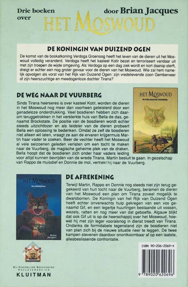 DE KONINGIN VAN DUIZEND OGEN De komst van de boskatkoning Verdoga Groenoog heeft het leven van de dieren uit het Moswoud volledig veranderd. Verdoga heeft het kasteel Kotir bezet en terroriseert vandaar uit met zijn troepen de wijde omgeving. Als Verdoga op een dag ziek wordt en kort daarop sterft, dreigt er echter een nog groter gevaar voor de dieren van het Moswoud. Wie zal hem opvolgen als vorst van het Rijk van Duizend Ogen: zijn vredelievende zoon Gemberveer of zijn heerszuchtige en meedogenloze dochter Tirana?