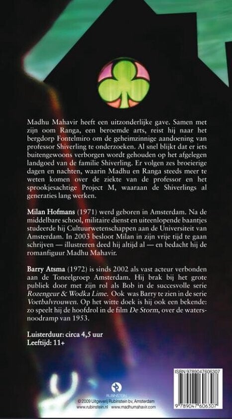 Madhu Mahavir heeft een uitzonderlijke gave. Samen met zijn oom Ranga, een beroemde arts, reist hij naar het bergdorp Fontelmiro om de geheimzinnige aandoening van professor Shiverling te onderzoeken. Al snel blijkt dat er iets buitengewoons verborgen wordt gehouden op het afgelegen landgoed van de familie Shiverling. Er volgen zes broeierige dagen en nachten, waarin Madhu en Ranga steeds meer te weten komen over de ziekte van de professor en het sprookjesachtige Project M, waaraan de Shiverlings al generaties lang werken. Milan Hofmans (1971) werd geboren in Amsterdam. Na de middelbare school, militaire dienst en uiteenlopende baantjes studeerde hij Cultuurwetenschappen aan de Universiteit van Amsterdam. In 2003 besloot hij in zijn vrije tijd te gaan schrijven - tekenen deed hij altijd al - en ontstond romanfiguur Madhu Mahavir. Barry Atsma (1972) is sinds 2002 als vast acteur verbonden aan de Toneelgroep Amsterdam. Hij brak bij het grote publiek door met zijn rol als Bob in de succesvolle serie Rozengeur & odka Lime. Ook was Barry te zien in de serie Voetbalvrouwen. Op het witte doek is hij ook een bekende: zo speelt hij de hoofdrol in de film De Storm, over de watersnoodramp van 1953, die in 2009 in première zal gaan.