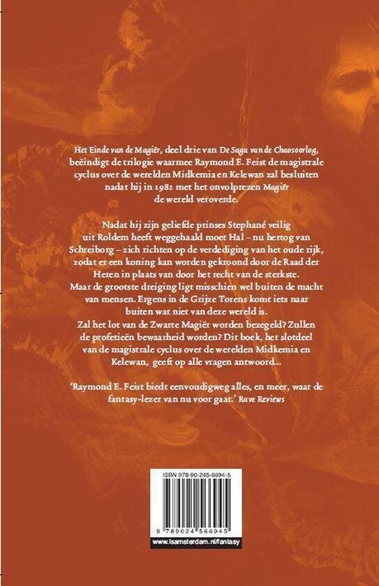 Het Einde van de Magiër, deel drie van De Saga van de Chaosoorlog, beëindigt de trilogie waarmee Raymond E. Feist de magistrale cyclus over de werelden Midkemia en Kelewan zal besluiten nadat hij in 1982 met het onvolprezen Magiër de wereld veroverde. Nadat hij zijn geliefde prinses Stephané veilig uit Roldem heeft weggehaald moet Hal - nu hertog van Schreiborg - zich richten op de verdediging van het oude rijk, zodat er een koning kan worden gekroond door de Raad der Heren in plaats van door het recht van de sterkste. Maar de grootste dreiging ligt misschien wel buiten de macht van mensen. Ergens in de Grijze Torens komt iets naar buiten wat niet van deze wereld is. Zal het lot van de Zwarte Magiër worden bezegeld? Zullen de profetieën bewaarheid worden? Dit boek, het slotdeel van de magistrale cyclus over de werelden Midkemia en Kelewan, geeft op alle vragen antwoord... 'Raymond E. Feist biedt eenvoudigweg alles, en meer, waar de fantasy-lezer van nu voor gaat.'