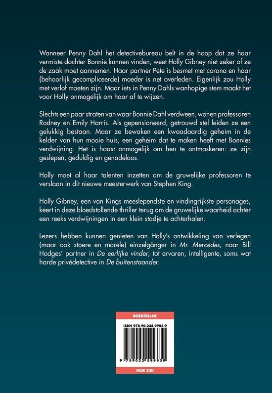 Wanneer Penny Dahl het detectivebureau belt in de hoop dat ze haar vermiste dochter Bonnie kunnen vinden, weet Holly Gibney niet zeker of ze de zaak moet aannemen. Haar partner Pete is besmet met corona en haar (behoorlijk gecompliceerde) moeder is net overleden. Eigenlijk zou Holly met verlof moeten zijn. Maar iets in Penny Dahls wanhopige stem maakt het voor Holly onmogelijk om haar af te wijzen.