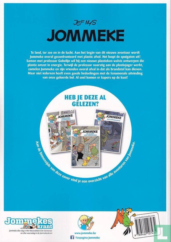 Te land, ter zee en in de lucht… overal wordt Jommeke geconfronteerd met plastic afval. Het loopt de spuigaten uit! Samen met professor Gobelijn wil hij een nieuwe plastieken walvis ontwerpen die plastic omzet in energie. Terwijl de professor naarstig aan de plasticjager werkt, zamelen Jommeke en zijn vrienden overal afval in dat als brandstof kan dienen. Maar niet iedereen heeft even goede bedoelingen met de fenomenale uitvindingn van onze geleerde bol. Al snel komen er kapers op de kust!